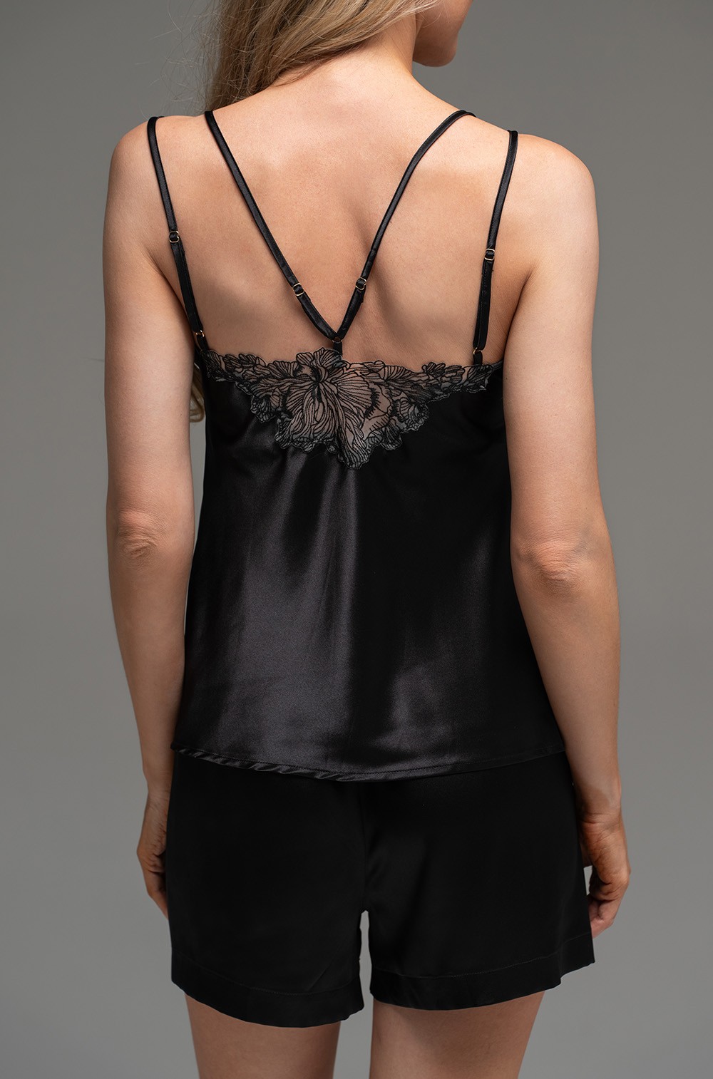 Комплект Mia-Amore выполнен из однотонного смесового шёлка, состоит из топа на тонких двойных регулируемых бретелях и шорт. Спинка топа украшена вставкой из ажурного кружева, вышитого на сетке.