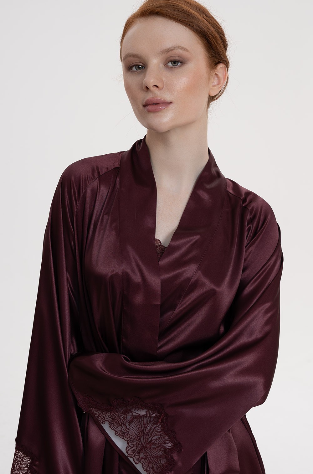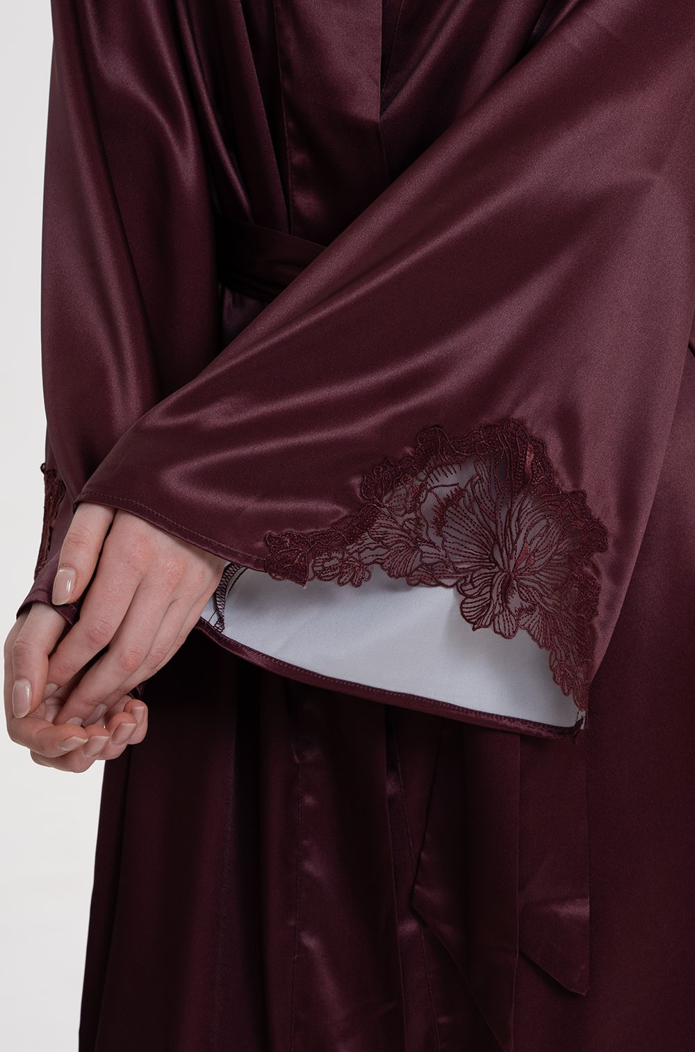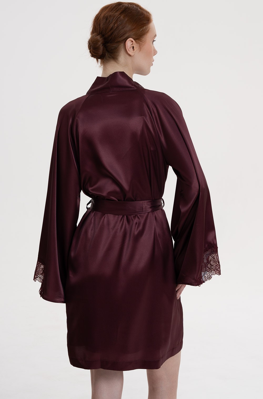 Короткий запашной халат Mia-Amore с длинными рукавами реглан выполнен из однотонного смесового шёлка. По низу рукава украшены ажурными вставками из вышитого кружева. В боковых швах есть карманы. Халат запахивается с помощью широкого съёмного пояса.