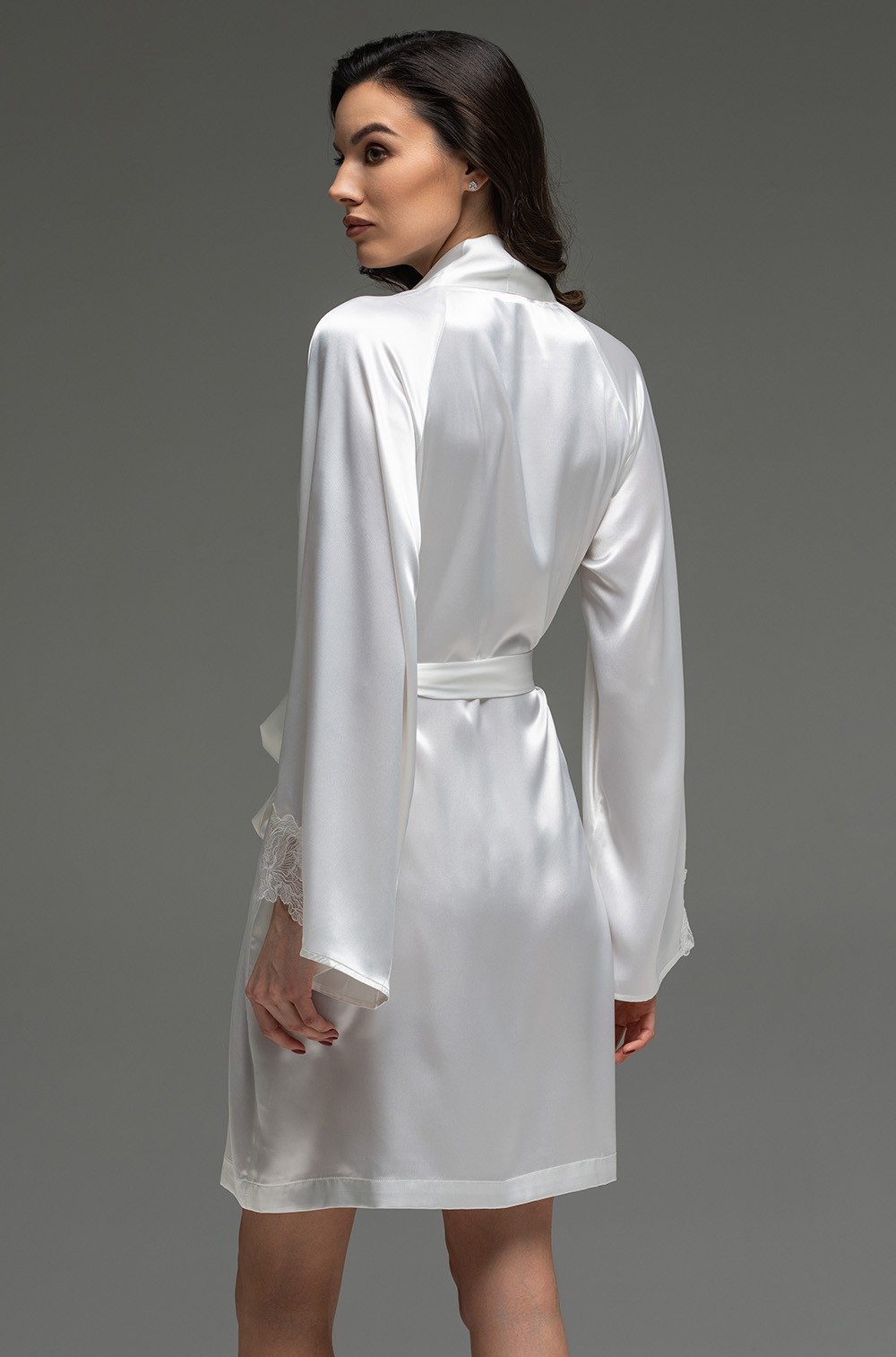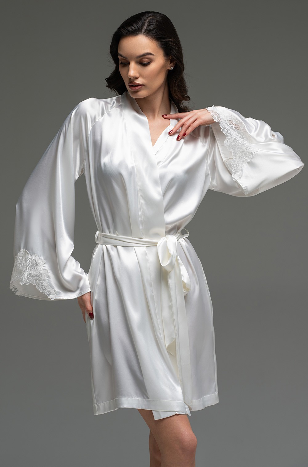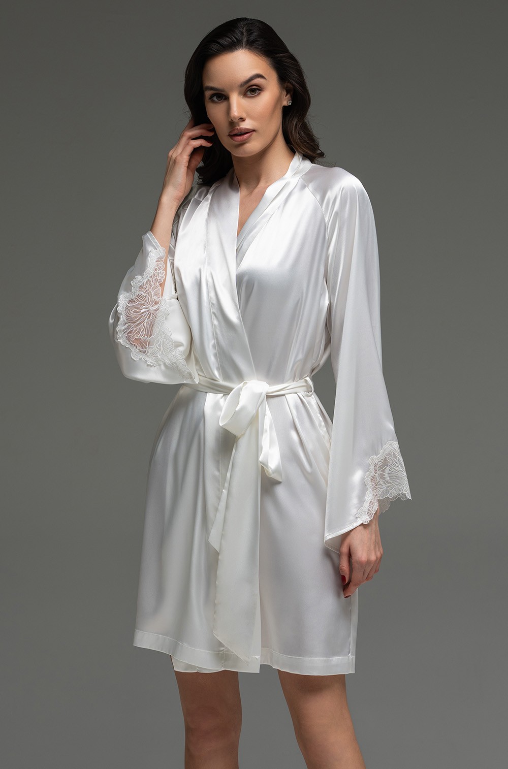 Короткий запашной халат Mia-Amore с длинными рукавами реглан выполнен из однотонного смесового шёлка. По низу рукава украшены ажурными вставками из вышитого кружева. В боковых швах есть карманы. Халат запахивается с помощью широкого съёмного пояса.