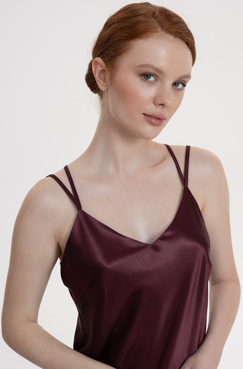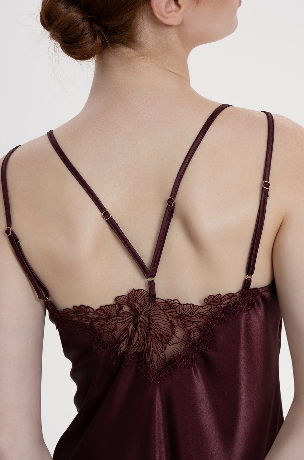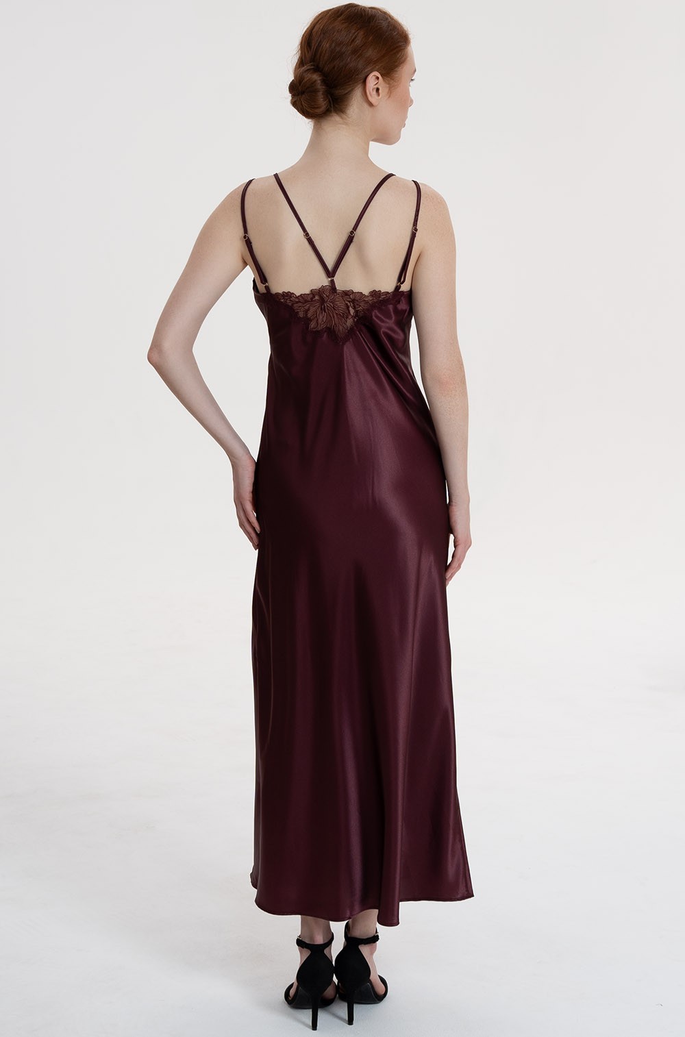 Длинная сорочка Mia-Amore на тонких двойных регулируемых бретелях выполнена из однотонного смесового шёлка. Спинка сорочки украшена вставкой из ажурного кружева, вышитого на сетке.