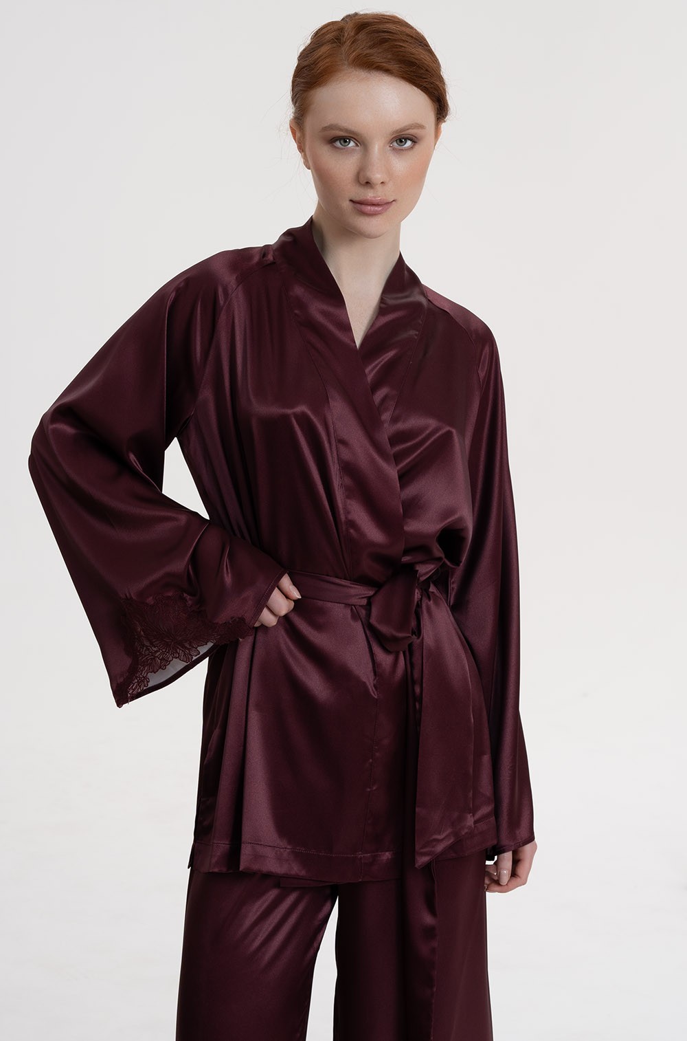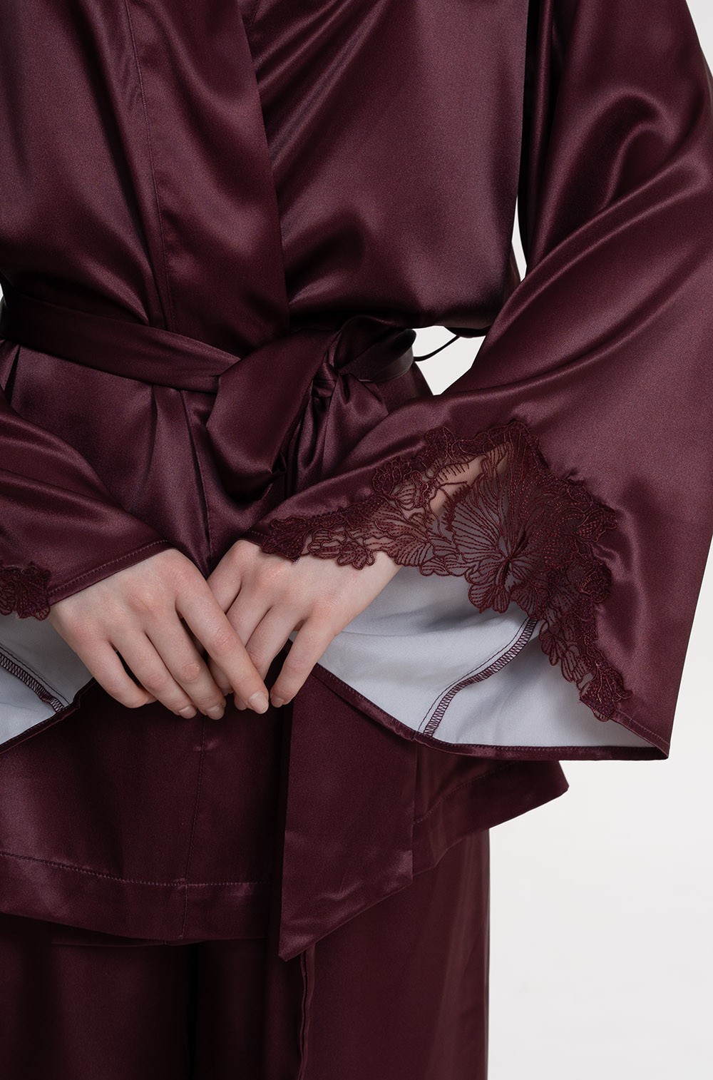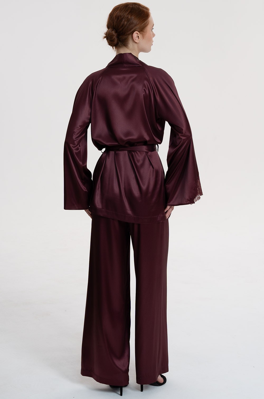 Комплект Mia-Amore выполнен из однотонного смесового шёлка, состоит из запашного жакета и брюк. Широкие брюки с эластичным поясом и карманами в боковых швах. По низу рукава жакета украшены ажурными вставками из вышитого кружева. Жакет запахивается с помощью широкого съёмного пояса.