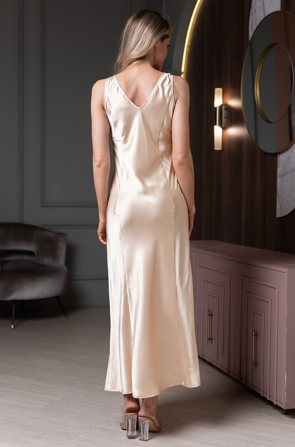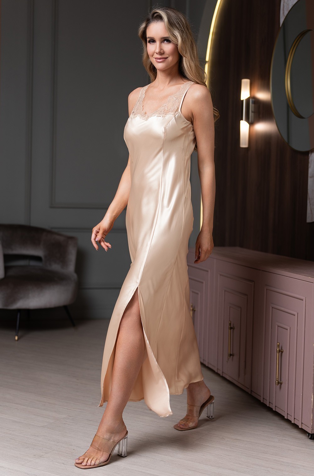 Длинная сорочка Mia-Amore выполнена из однотонного смесового шёлка. Бретели сорочки маечного типа, изысканный силуэт сорочки образуют вертикальные рельефы спереди и сзади. Горловину сорочки сверху украшают вставки из изысканного вышитого кружева.