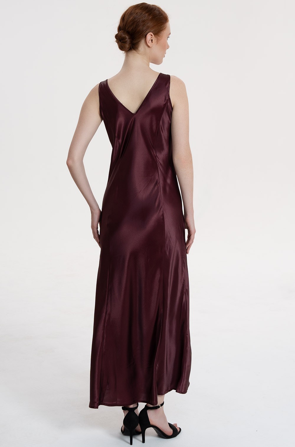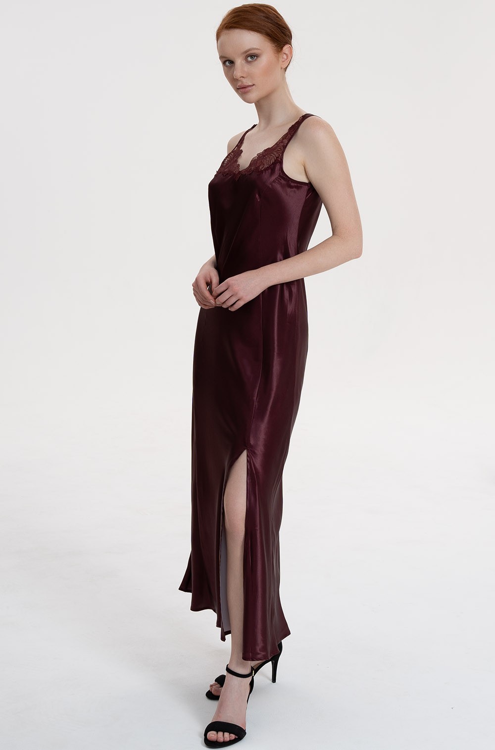 Длинная сорочка Mia-Amore выполнена из однотонного смесового шёлка. Бретели сорочки маечного типа, изысканный силуэт сорочки образуют вертикальные рельефы спереди и сзади.  Горловину сорочки сверху украшают вставки из изысканного вышитого кружева.