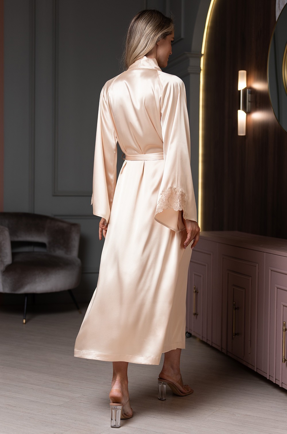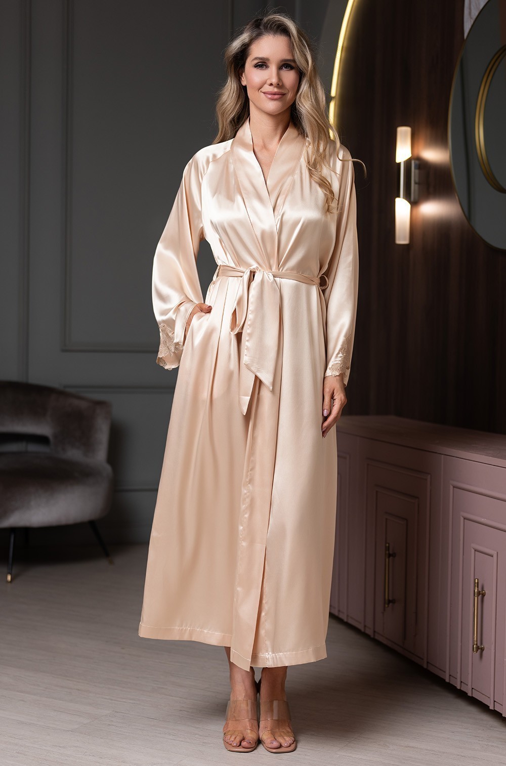 Длинный запашной халат Mia-Amore с длинными рукавами реглан выполнен из однотонного смесового шёлка. По низу рукава украшены ажурными вставками из вышитого кружева. В боковых швах есть карманы. Халат запахивается с помощью широкого съёмного пояса.