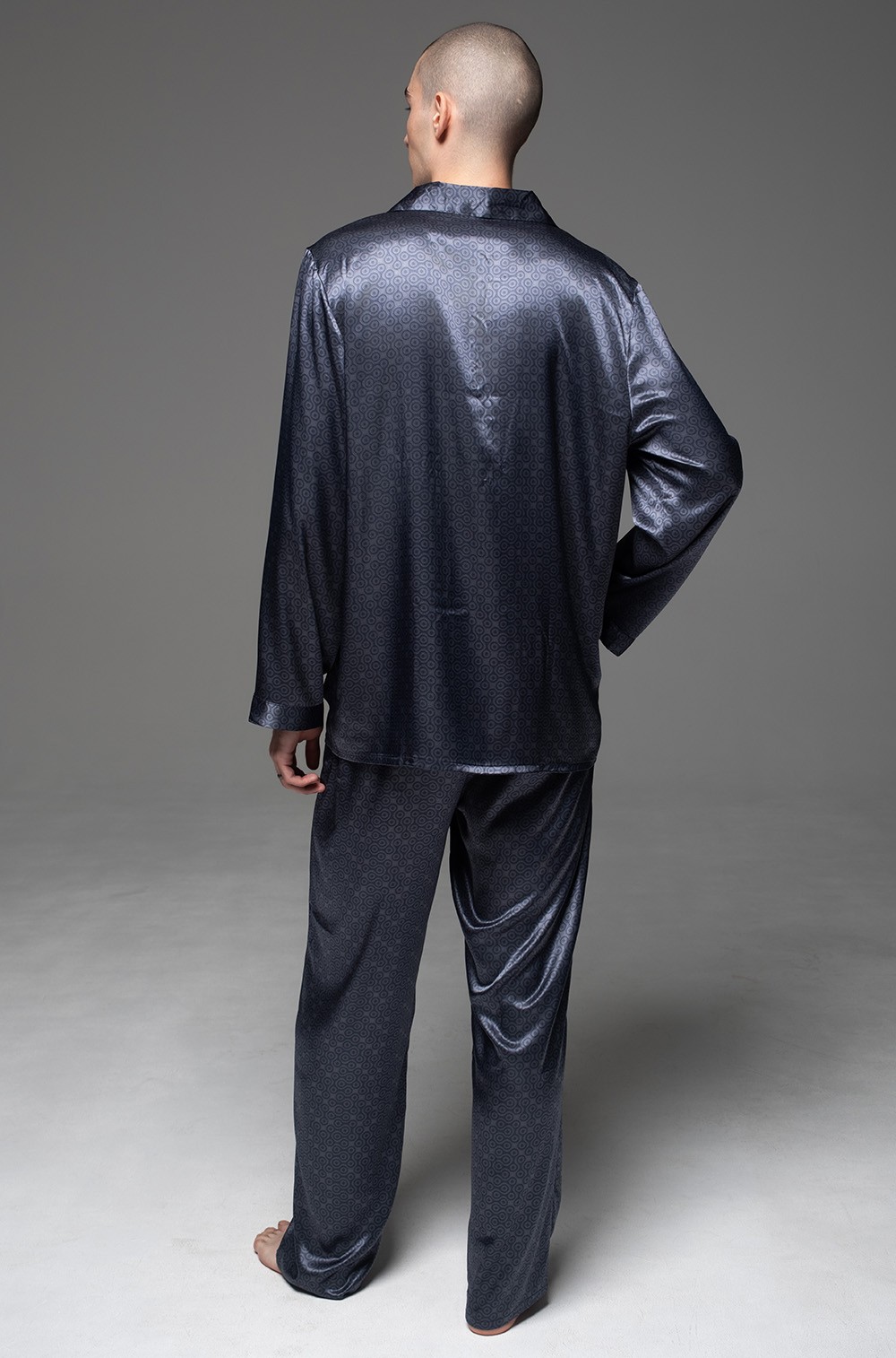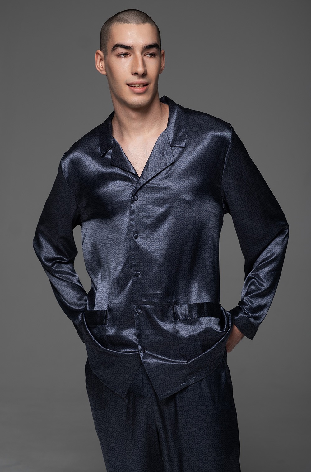 Мужской комплект Mia-Amore состоит из рубашки на пуговицах и брюк, выполнен из принтованного смесового шелка. По бокам брюк расположены карманы.